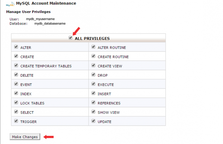 Click on the Make Changes button, your MySQL database and user are now ready to use. Write down your database name, MySQL username and password, you will need this information later.