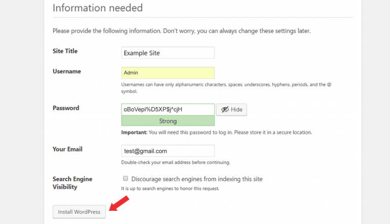 If you don’t want your website to be visible to the search engines, check the box next to search engine visibility. Later when your website is complete you can modify this option in the WordPress settings. If you are unsure about what to do, then simply leave it unchecked.