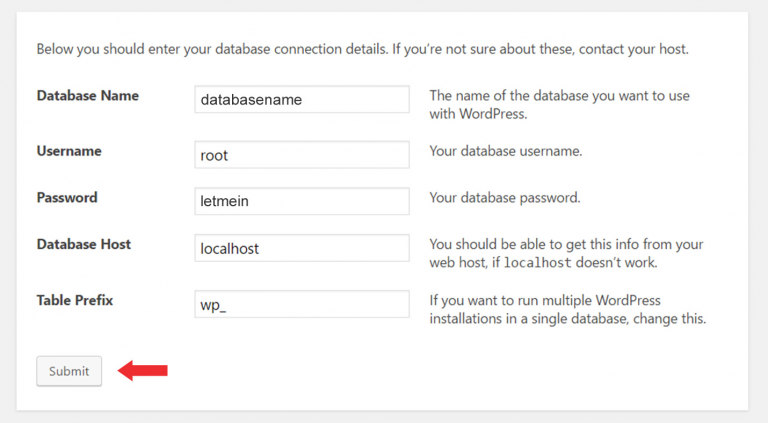 Fill in the form with the information you created previously, then click on the Submit button. WordPress will connect to your database and you will be able to run the WordPress install: